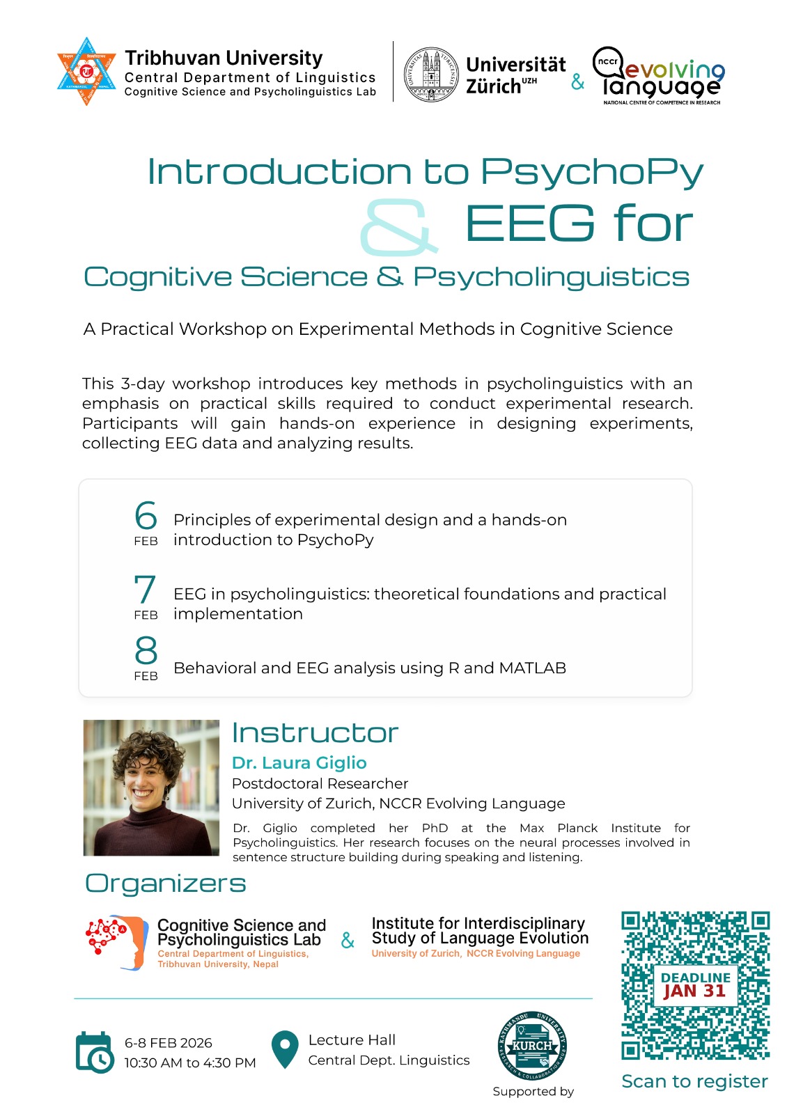 Laura Giglio held a three-day workshop to introduce key methods in psycholinguistics from February 6 to February 8 in Kathmandu, Nepal, at Tribhuvan University.